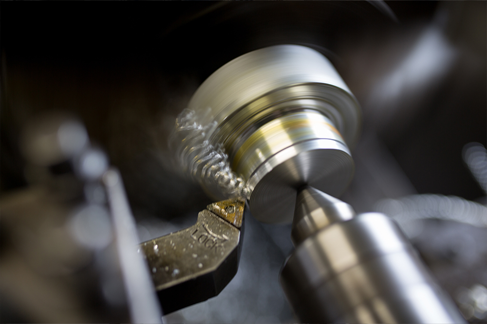 「旋盤加工」では、円筒形の部品を回転させて刃物状の工具(バイト)を当て、穴あけ・中ぐり・ねじ切りなどの加工を行ないます。
